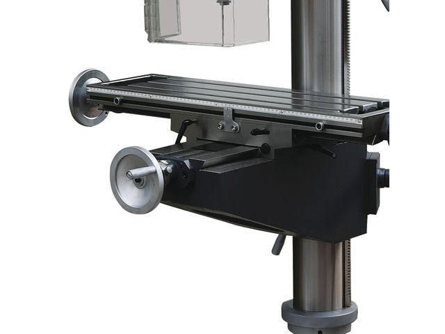 - Table croisée de grandes dimensions, usinée et rectifiée avec précision, avec rainurage en “T”, renforts arrière et double verrouillage, échelle millimétrique