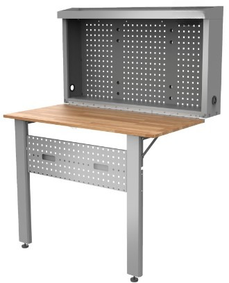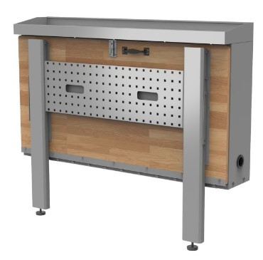 Son panneau arrière se fixe au mur d'un sous-sol ou d'un garage pour ranger et organiser les outils. Un système à loquet est livré de série afin d’assurer et de maintenir l’établi en position.