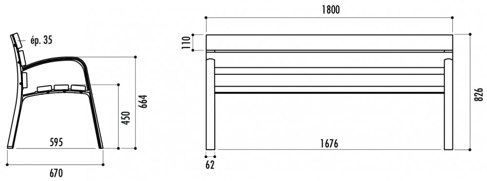 Les lames de ce banc public au nombre de six sont en pin traité autoclave classe IV et certifié FSC d'une épaisseur de 35 mm.