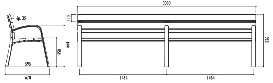 Banc en bois 3 pieds - Longueur 3000 mm