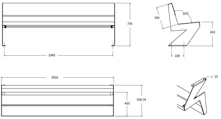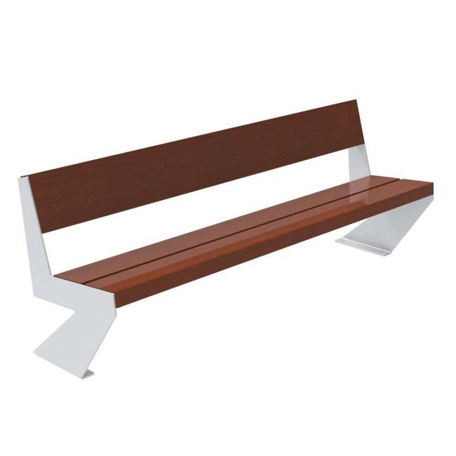 Longueur : 2016 mm Bois de Guinée 3 lames Piétement : oxiron, acier ou inox A sceller