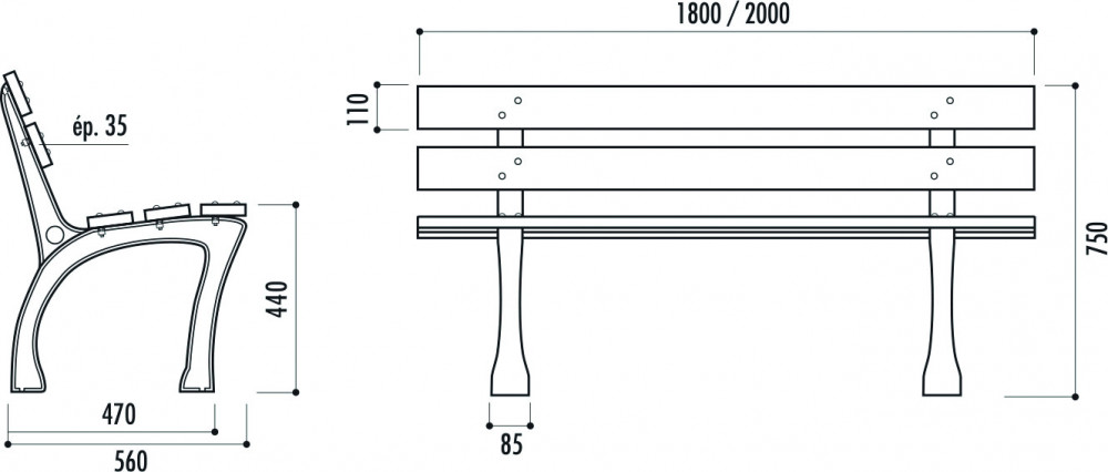 Les pieds du banc sont en fonte ductile, traitée antirouille finition peinture laquée noire RAL 9005, pour une meilleure protection contre la corrosion.