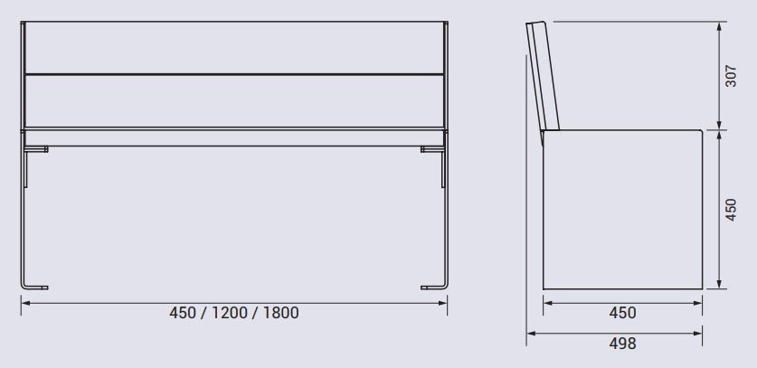 Longueur : 450, 1200 ou 1800 mm Hauteur d’assise : 450 mm Version : acier et bois ou tout acier Bois finition acajou ou chêne clair Livré prêt à monter