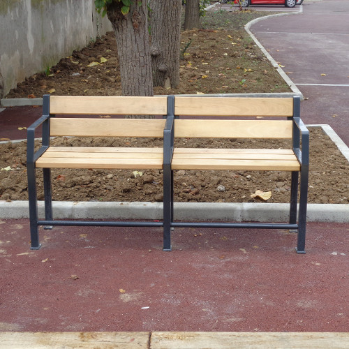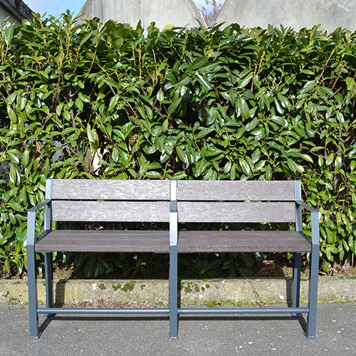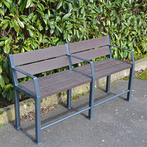 Un troisième accoudoir central peut être livré sur demande sans supplément. Livré monté. Temps de montage estimé sur sol dur (béton 8 cm mini) : 4 bancs à l’heure à 2 personnes.