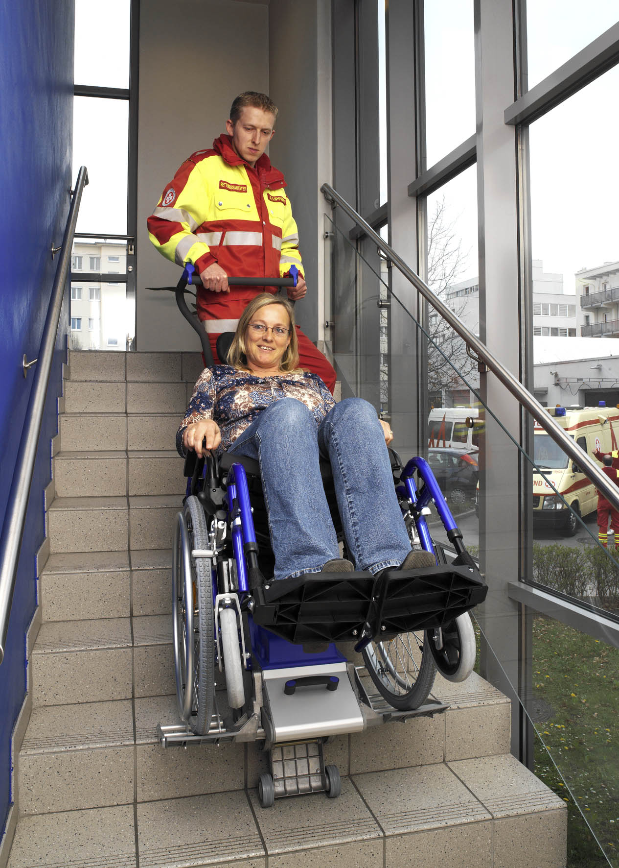 J"ai besoin des renseignements pour monter et dencendre une personne agée en securité, Elle possede dèja son fauteuil roulant manuel. Appareil ou fauteuil pas trop lourd et si possible pliant.