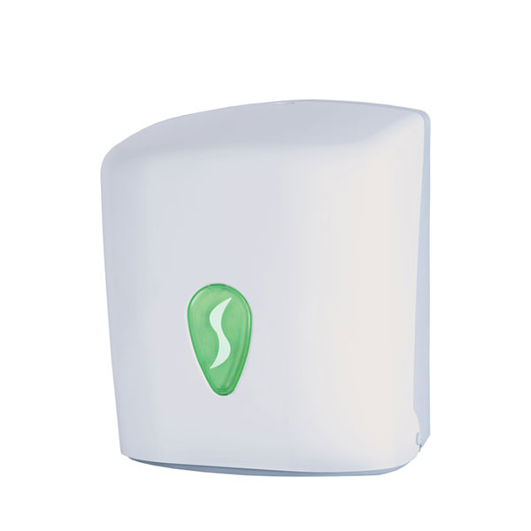 distributeur pour bobine d’essuyage a devidage central en ABS 100% recyclé. pour équiper vos locaux.