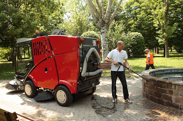 Il me faudrait une machine étant équiper d"une lance HP pour retirer les traces de graisse ou autres et capable de balayer des allées de circulation en goudron.