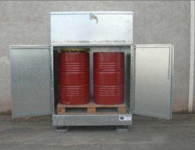 Le Box de stockage en acier galvanisé avec bac de rétention, d'une capacité de 220 litres, convient pour le stockage jusqu'à 2 fûts.