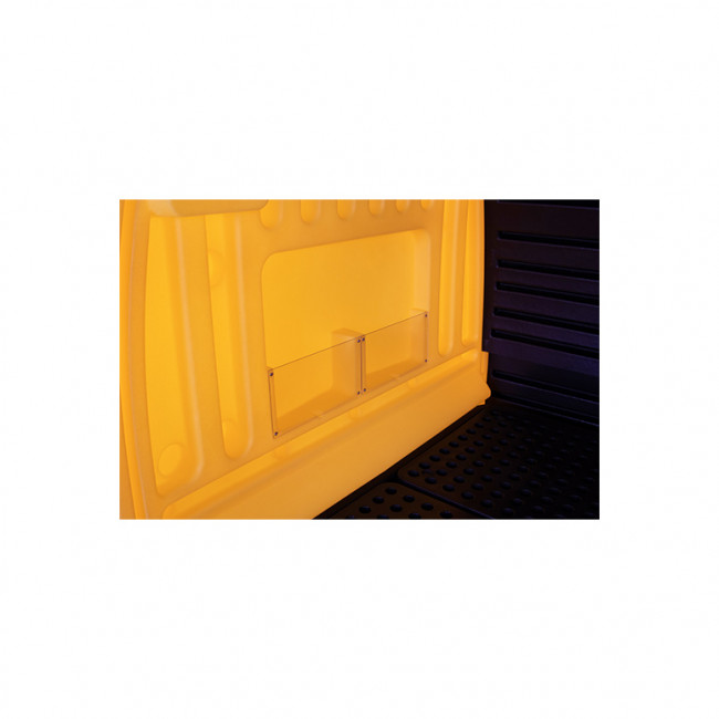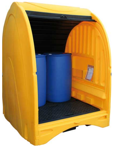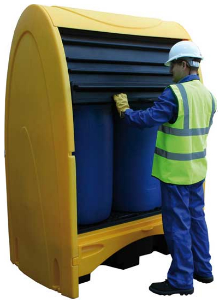 Cette box de stockage à rideaux pour fûts 250 L permet le stockage de 2 ou 4 fûts contenant des produits chimiques ou déchets dangereux grâce à sa double paroi.
