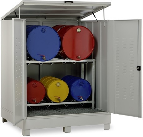Ce box de rétention en acier pour fûts est conçu pour le stocker des liquides inflammables à l’extérieur.