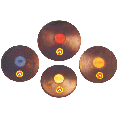 Ces disques de lancer d'athlétisme disposent de pastilles de couleurs pour les reconnaitre plus rapidement.
