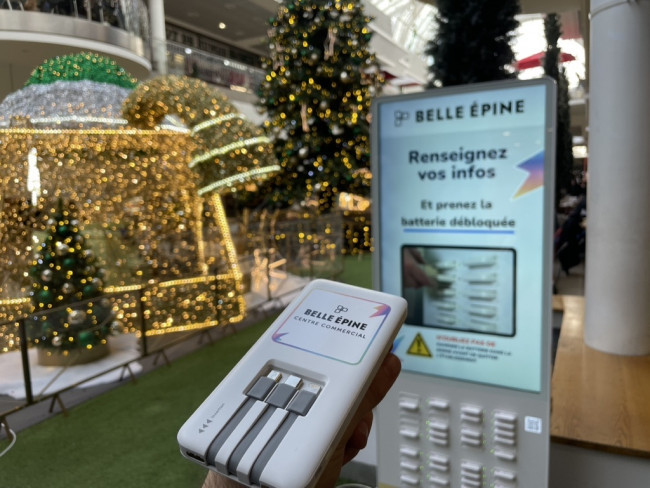 - 48 batteries portables en libre-service avec câbles intégrés (Lightning, Micro USB, USB C)