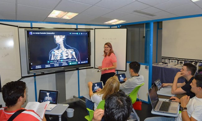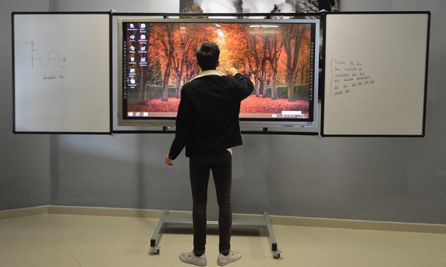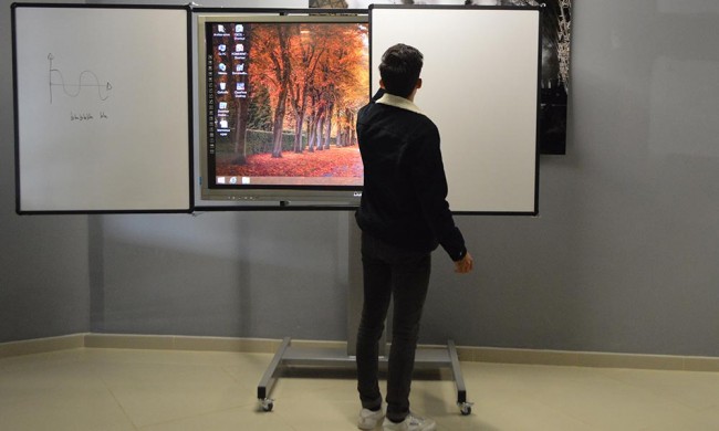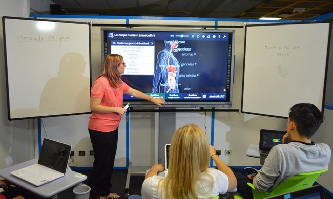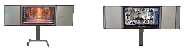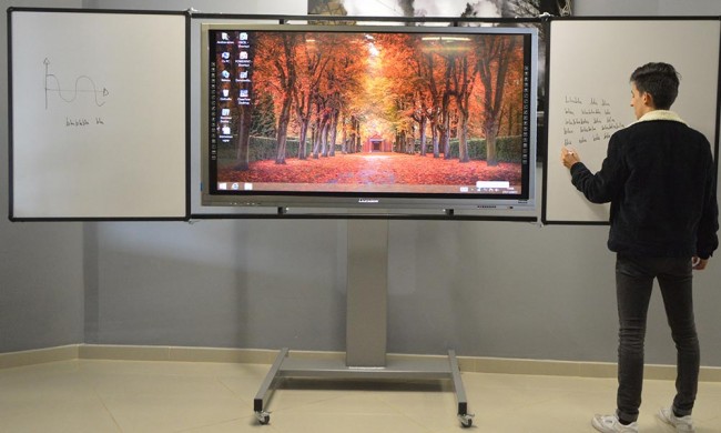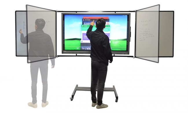 Ce système numérique modulaire associe un écran de 65 ou 75 pouces entre deux tableaux blancs pivotants 4 faces d'écriture pour un meuble mobile (ou fixe) réglable en hauteur.