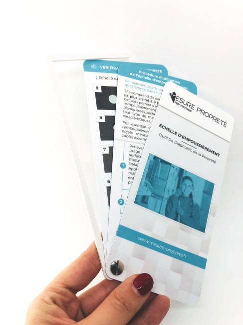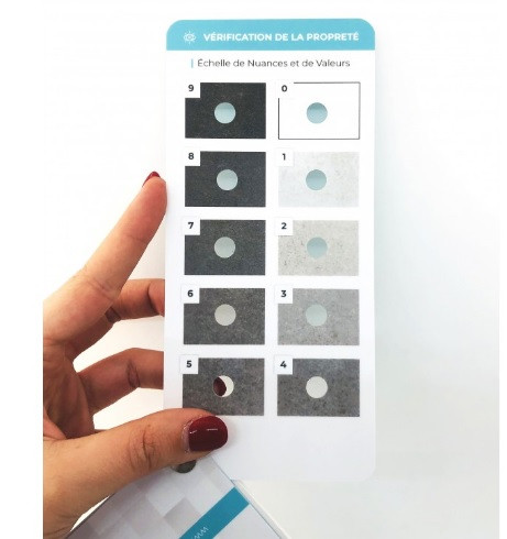 Le contrôle est réalisé en frottant une surface normalisée disponible sur notre outil avec un simple mouchoir en papier blanc. Le passage du mouchoir permet de "capter" les poussières. Le "gris" du mouchoir est ensuite comparé à celui de l'échelle en le plaçant derrière les orifices présents sur l'instrument. La comparaison de la couleur obtenue lors du frottis sur le papier blanc permet de déterminer la note du diagnostic réalisé. Cette note est ensuite comparée aux seuils autorisés et permet d’établir la conformité de la mesure ou alors la non-conformité.