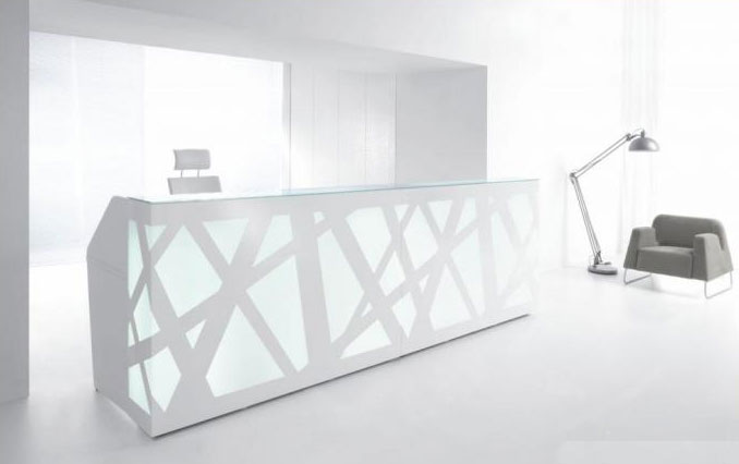 Comptoir d’accueil design avec éclairage dont la forme originale permet de bien organiser chaque espace.