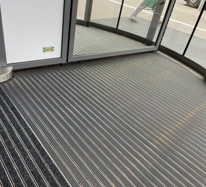 Sa structure combine des profilés en aluminium anodisé et des inserts en caoutchouc strié, offrant une solution fiable pour le nettoyage intensif des semelles dès l’entrée du bâtiment.
