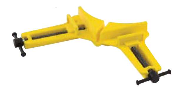 Étau d'angle avec mâchoires adaptables pour serrer des objets d'épaisseur égale ou différente en équerre à 90°, munie de 2 trous pour fixation sur l' établi et un corps en alliage d' aluminium.