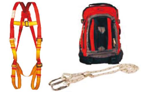 - Kit de secours avec harnais à attache frontale, cordeau restreint et ajustable avec 2 mousquetons à vis et un sac à dos.