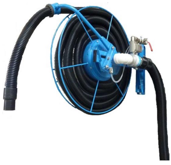 - Après utilisation du flexible et son enroulement, une guillotine ferme l’orifice d’aspiration et le micro distributeur pneumatique coupe l’alimentation en air comprimé. Le venturi est arrêté.