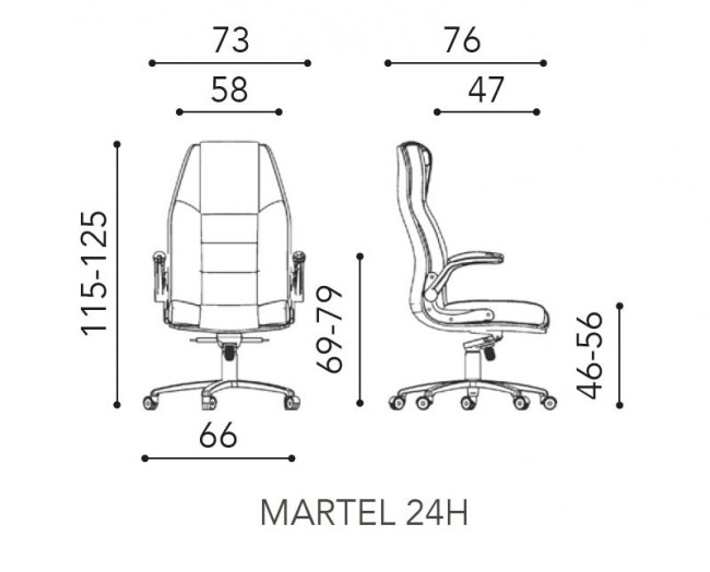 Les accoudoirs tapissés sur le dessus sont rabattables et ajustables. Il est muni d'un mécanisme à bascule multiblok avec axe de bascule avancé de 160 mm pour un plus grand confort, verrouillage quintuple et réglage de la force du contrepoids dans la plage de poids de 60 à 130 kg. Son piétement standard est en aluminium poli. Le réglage de la hauteur du siège se fait par un vérin à gaz, les roulettes sont en caoutchouc pour tous types de sols. La charge maximum du siège est de 150 kg.