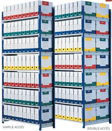 01/10/2025Rayonnage d"archivage metalique, face unique à tablette réglable tous les 5 cm.