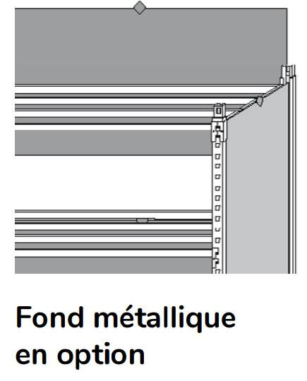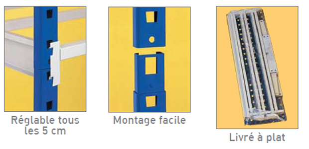 equipée chacune de 8 étagéres tolées pouvant recevoir 180 kg, réglable au pas de 31.25 mm.