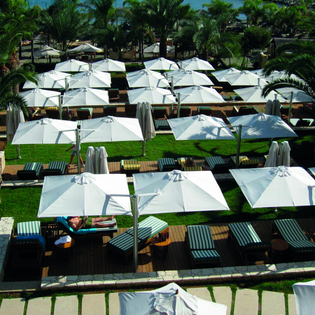 Ce parasol intègre un système breveté de manœuvre manuelle qui garantit une ouverture et une fermeture en un seul mouvement fluide.