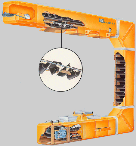En dehors des élévateurs classiques pour le transport vertical, la conception de cet appareil lui permet d'effectuer une manutention continue aussi bien sur des plans horizontaux que verticaux sans déversement des produits transportés. C'est un élévateur spécial, parfaitement adapté au transport sans risque de casse, et convenant particulièrement aux produits qui ne doivent pas être endommagés, mélangés ou dissociés pendant le transport.