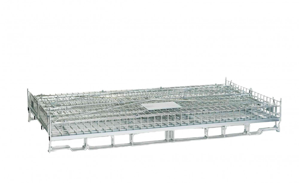 Elle est repliable et équipée de pieds adaptés au retournement et basculement par chariot élévateur équipé de fourches rotatives.
