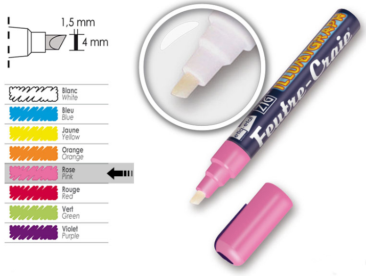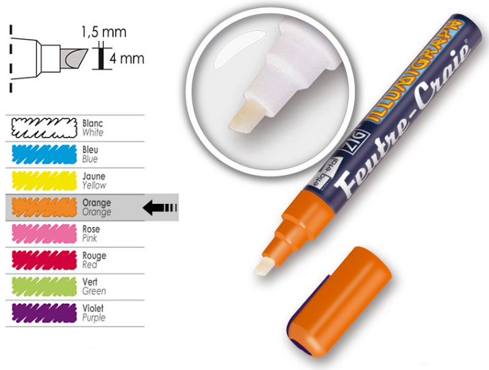 Feutre à craie liquide , de très bonne qualité, à base d’eau ce qui permet de l’effacer avec un chiffon humide .
