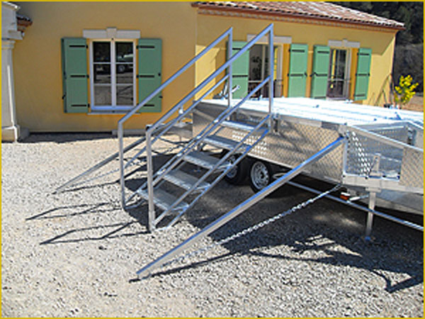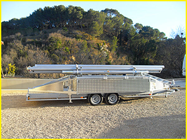 La stabilisation de la remorque se fait par 4 béquilles manuelles situées au centre de la structure et 6 autres viennent élargir autour.