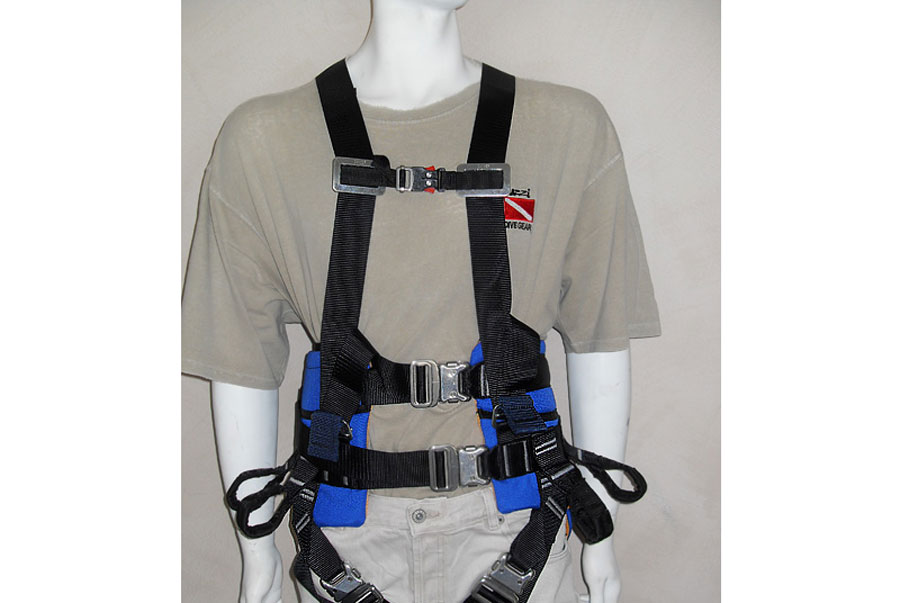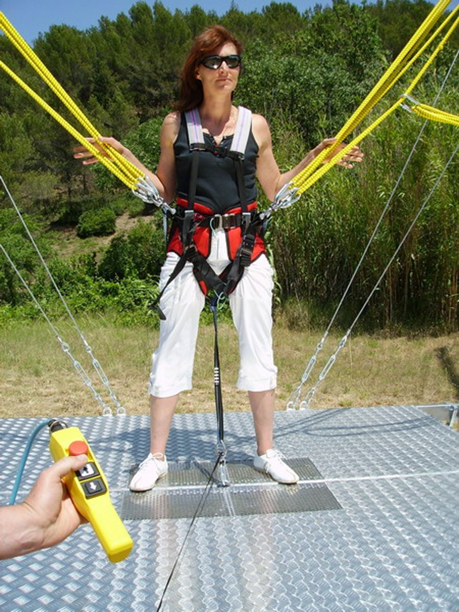Au centre de la structure, l'utilisateur prend place, le technicien lui pose un harnais muni de bretelles qui est retenu au socle du