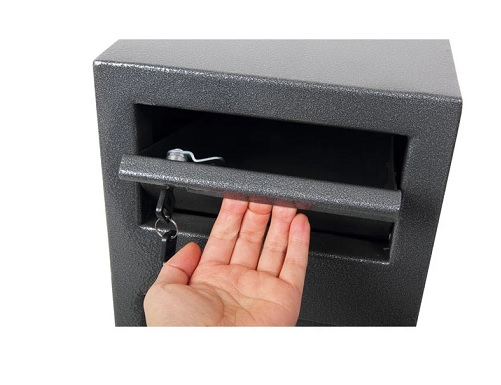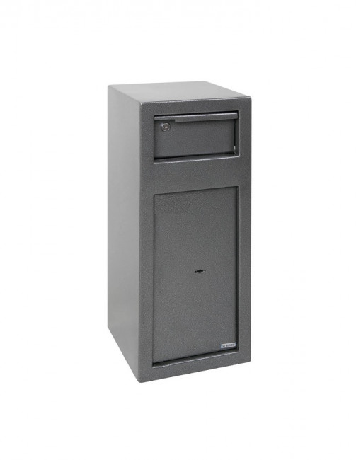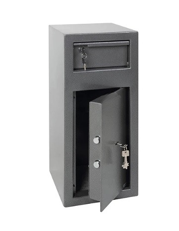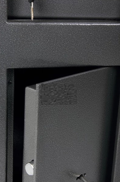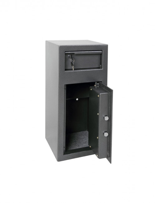 Le dépôt frontal avec déflecteur basculant facilite le dépôt d'argent, en empêchant toute récupération non autorisée. |