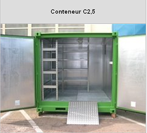 Nous sommes à la recherche d"un container pouvant acceuillir des produits chimiques, des huiles et des graisses. Pourrie vous nous faire parvenir un devis pour le Modèle C2.5 qui nous parait adapté à nos besoins.