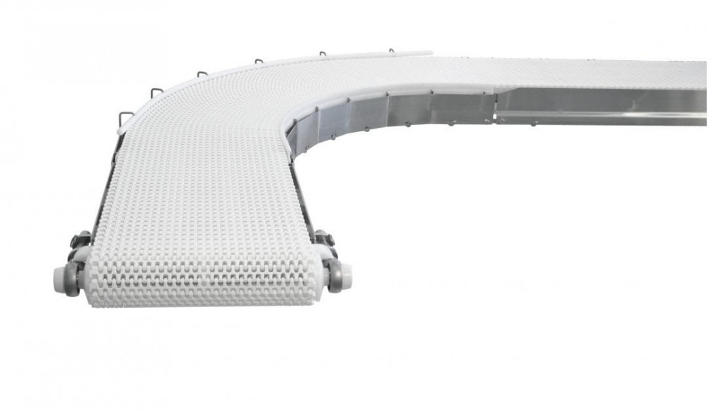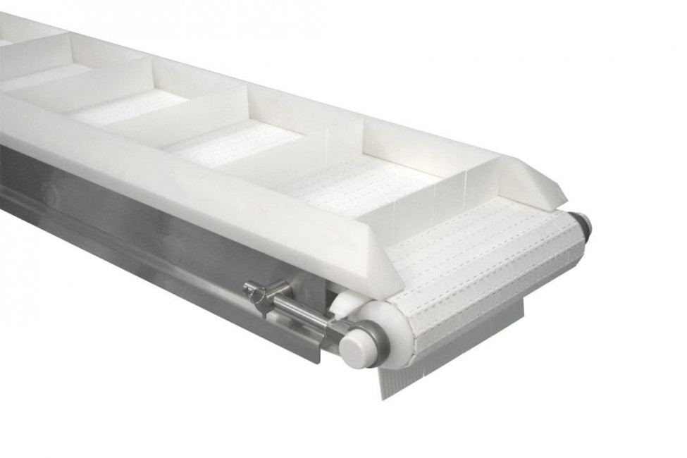 Découpes de cadre, barres de transfert UHMW (diamètre minimum : 38 mm), élévateurs et différents types de courroies : à tasseaux, courbes, cadre en Z.