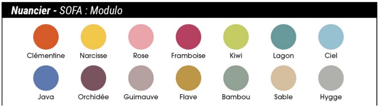 La gamme de coloris variés : Clémentine, Narcisse, Rose, Framboise, Kiwi, Lagon, Ciel, Java, Orchidée, Guimauve, Flave, Bambou, Sable, Hygge, permet une personnalisation poussée pour des espaces colorés et agréables à vivre.