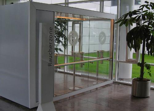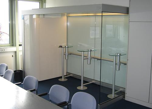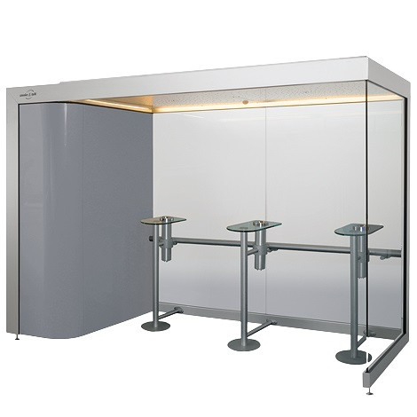 - La variante "charge d’incendie neutre" est proposée dans les domaines ou une exigence vis-à-vis du classement au feu est spécifiée. La MPA Dresden certifie l’utilisation de matériau non inflammable pour la réalisation de cette cabine fumeur à "charge d’incendie neutre".