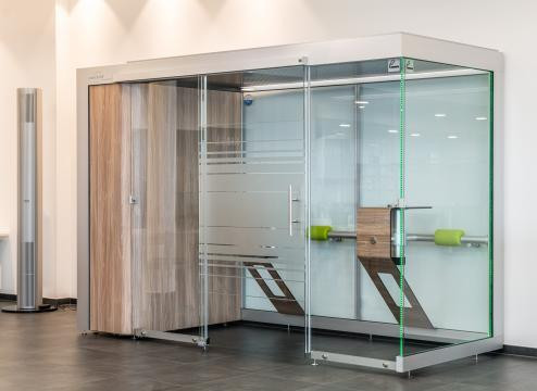 - Façade vitrée avec porte coulissante en verre intégrée, disponible en option