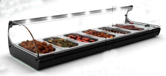 Elle permet de recevoir 4 ou 6 bacs GN 1/3 (selon modèle), et est doté d'une vitre bombée transparente basculante.