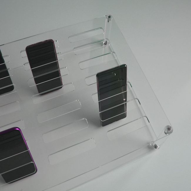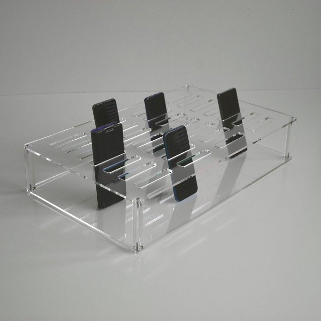 Ce plateau en plexiglas rigide est conçu pour organiser et ranger les téléphones portables de manière efficace.