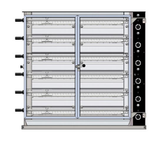 Chaque broche peut accueillir jusqu’à 6 poulets d’environ 1,2 kg, avec un réglage en profondeur qui s’adapte aux différentes tailles de pièces.