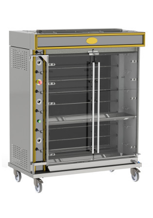 - Décor demi-rond aspect inox ou laiton (à préciser à la commande). - Vitrage et broches à griffes. - Bac à sauce + robinet de vidange. - Un moteur par broche. - Option possible : Broche verticale avec motorisation (à prévoir lors de la commande).
