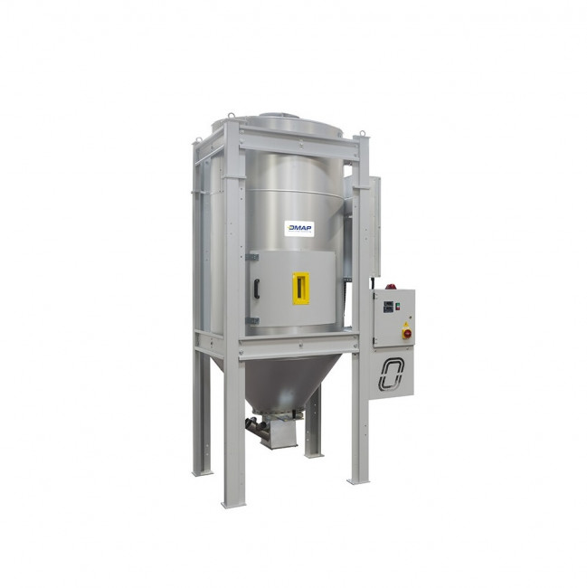 L’air chaud de traitement passe à la trémie de retenue du matériau, de bas en haut, où il chauffe les granulés en éliminant l’humidité superficielle et en la vaporisant à l’intérieur du flux d’air chaud.