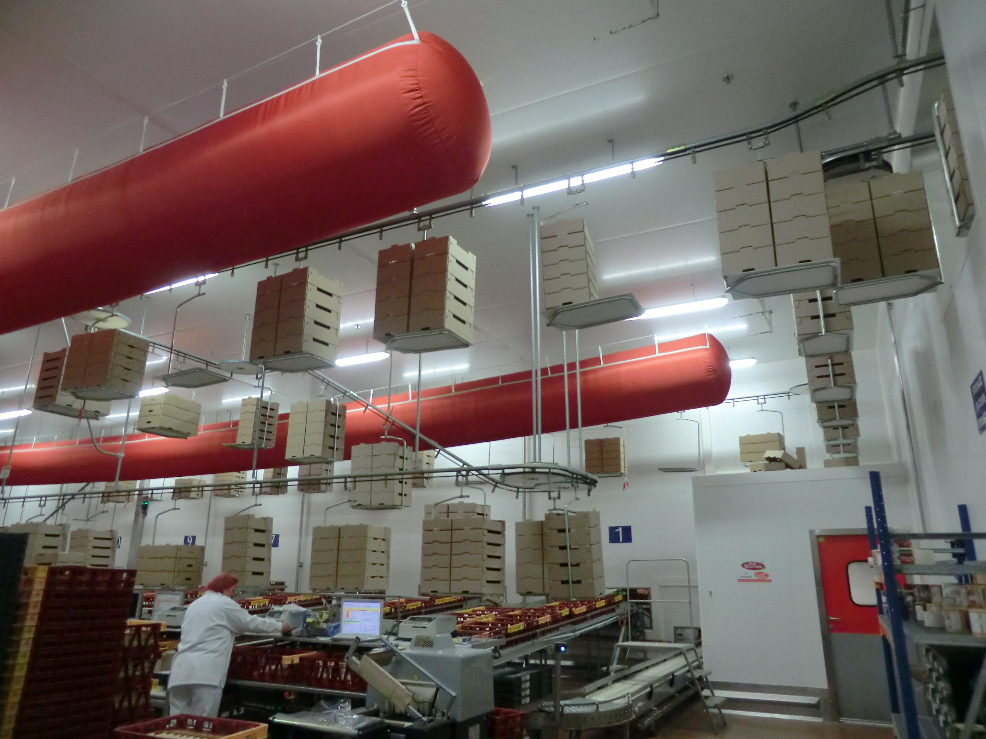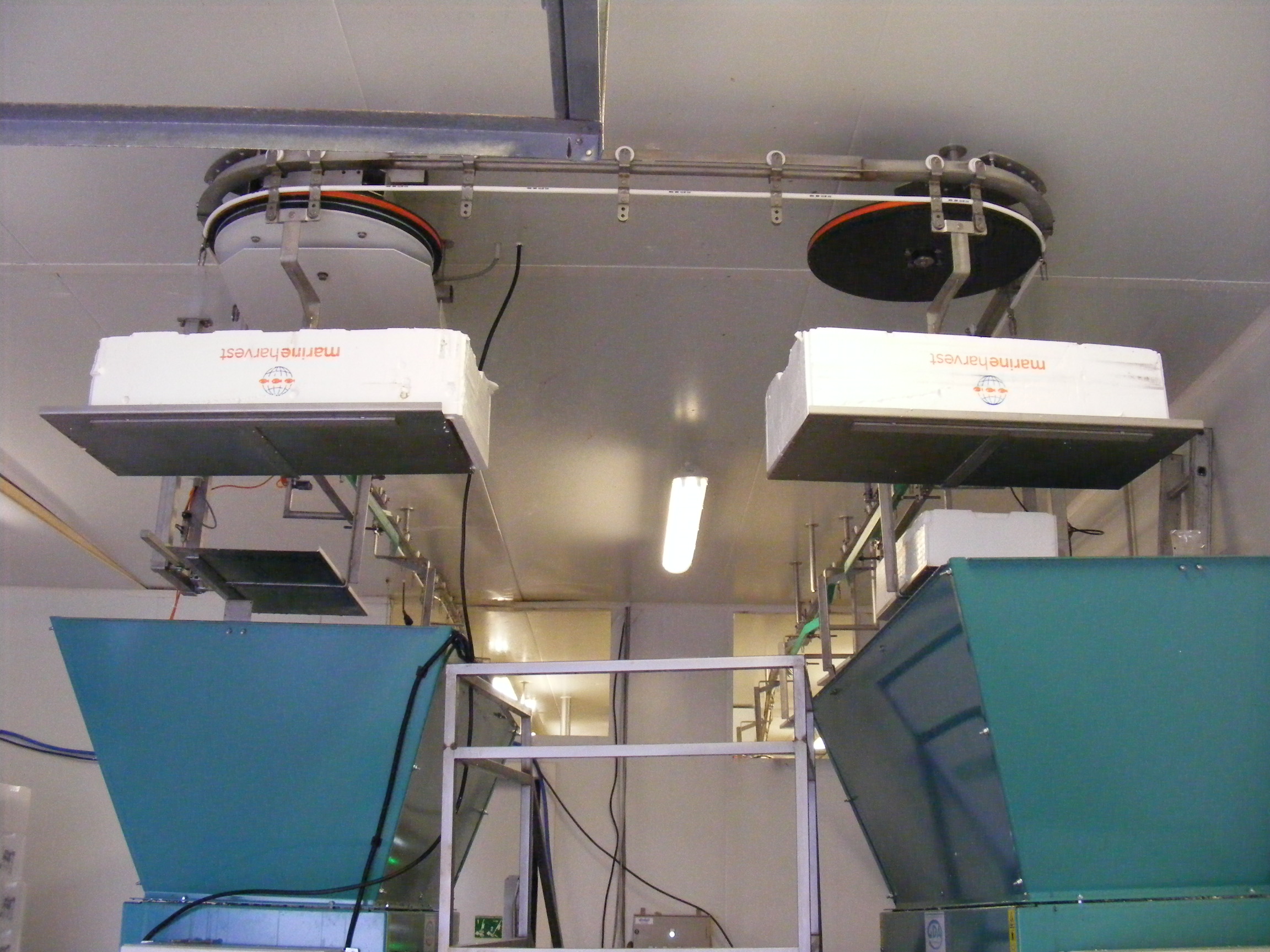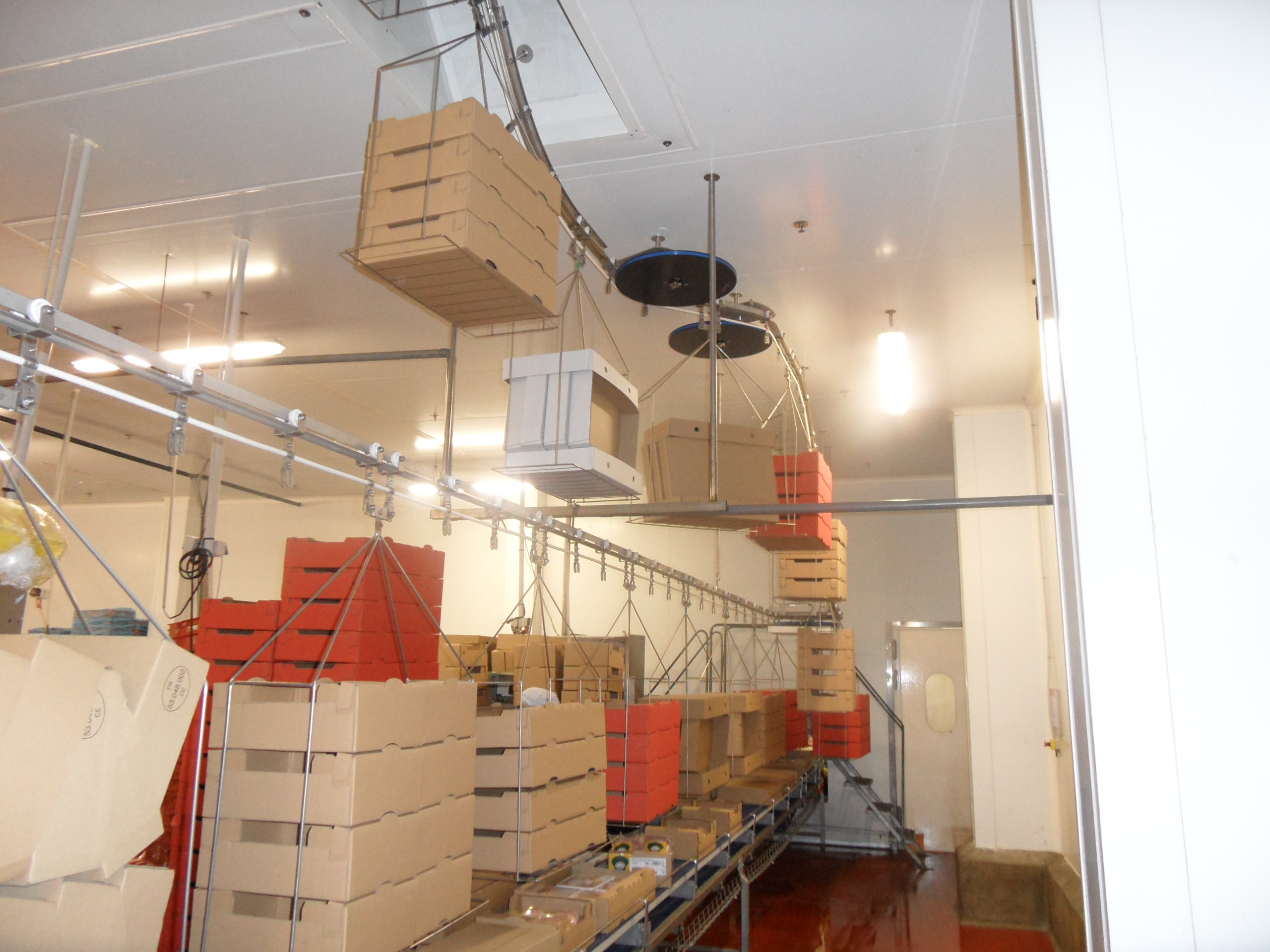 - La société FIZZY (confiserie) avait un problème d’évacuation des cartons vides aux postes de travail à destination du compacteur : encombrement des postes de travail, déplacement des opérateurs ... CMAT a mis en place un convoyeur aérien, où chaque opérateur dépose ses cartons sur des balancelles qui sont automatiquement déchargées dans le compacteur par l’intermédiaire d’une goulotte et d’un bras pneumatique.