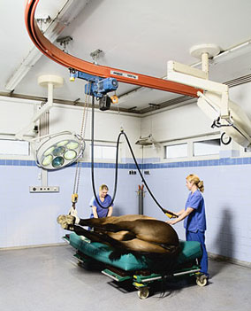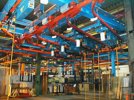 Nous aimerions utiliser un convoyeur aérien, qui permettrai de déplacer ces chariots ( 900 x 400 x 2000 ) de façon autonome. Il y a un totale 48 chariot qui doivent être stocké pour la nuit dans une pièce.