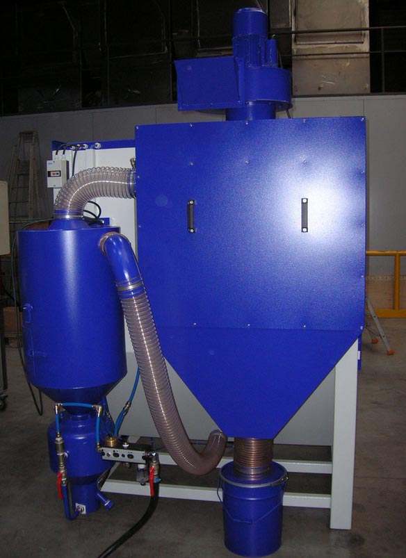 - l'aspiration d'une grenailleuse à pression consiste d'une trémie de récupération de grenailles et de poussières, équipées de conduites d'évacuation anti-abrasive, dans lesquelles le tout est aspiré vers le cyclone.
