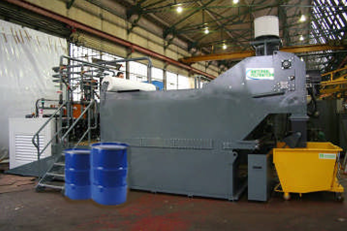 - Lorsque la surface filtrante totale est colmatée, le système de détection de niveau haut assure l’automatisme de l’évacuation du média saturé dans une boite à déchets et son renouvellement ou le recyclage du média permanent intégrant le lavage et le séchage après avoir raclé les copeaux collectés.