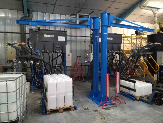Ensemble composé de 2 à 8 débitmètres avec compteurs programmables à affichage numérique pour la visualisation et le réglage des volumes à conditionner, quatre becs de remplissage en pvc à commande pneumatique, une potence à flèche orientable, et une cuve tampon à niveau régulé.