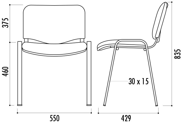 Cette chaise empilable possède une hauteur d’assise de 460 mm et une hauteur totale de 835 mm, avec une largeur de 550 mm et une profondeur de 429 mm.