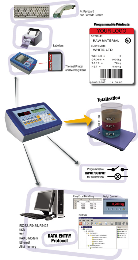 Permettant de réaliser des opérations de pesage évoluées pour la totalisation et/ou formulation basic de poids avec impression complète des données mémorisées. Homologable CE-M (OIML R-76/EN 45501).
